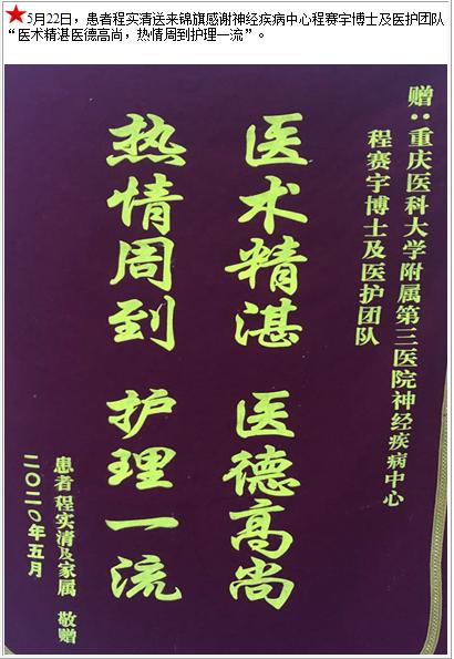 患者程实清送来锦旗感谢神经疾病中心程赛宇博士及医护团队“医术精湛医德高尚,热情周到护理一流”-锦旗-患者心声-患者服务-重庆医科大学附属第三医院【官方网站】