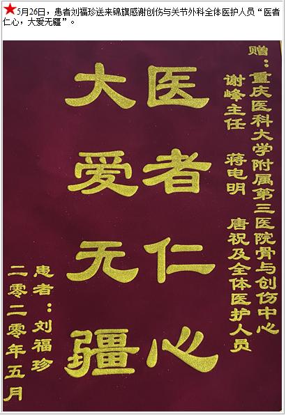 患者刘福珍送来锦旗感谢创伤与关节外科全体医护人员“医者仁心,大爱无疆”-锦旗-患者心声-患者服务-重庆医科大学附属第三医院【官方网站】