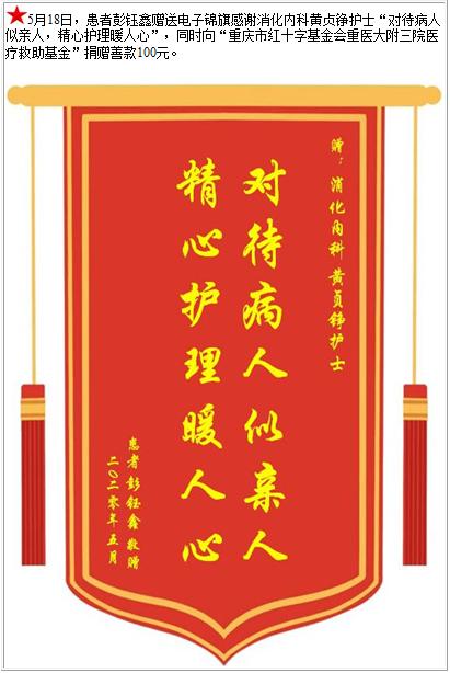 患者彭钰鑫赠送电子锦旗感谢消化内科黄贞铮护士,并向医疗救助基金捐赠善款100元-锦旗-患者心声-患者服务-重庆医科大学附属第三医院【官方网站】