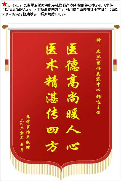 患者罗治然赠送电子锦旗感谢皮肤/整形美容中心郝飞主任,并向医疗救助基金捐赠善款100元-锦旗-患者心声-患者服务-重庆医科大学附属第三医院【官方网站】