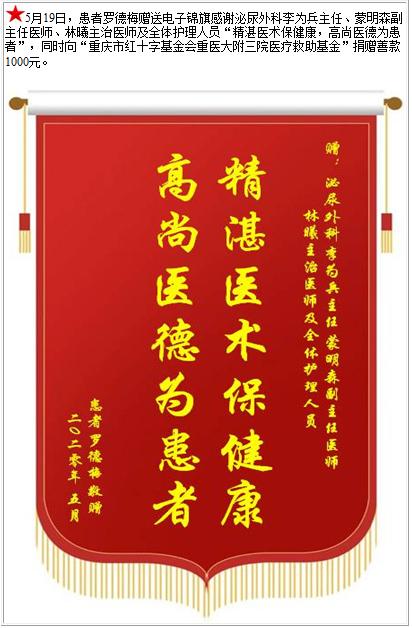 患者罗德梅赠送电子锦旗感谢泌尿外科李为兵主任等人及全体护理人员,并向医疗救助基金捐赠善款1000元。-锦旗-患者心声-患者服务-重庆医科大学附属第三医院【官方网站】