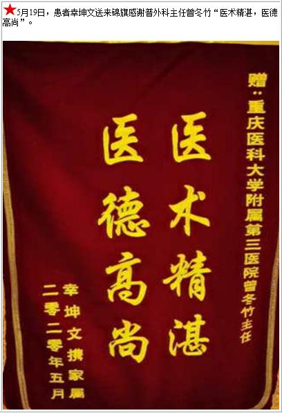 患者幸坤文送来锦旗感谢普外科主任曾冬竹“医术精湛,医德高尚”-锦旗-患者心声-患者服务-重庆医科大学附属第三医院【官方网站】