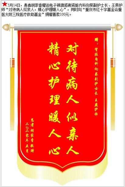 患者胡家香赠送电子锦旗感谢肾脏内科向葵副护士长等人,并向医疗救助基金捐赠善款100元-锦旗-患者心声-患者服务-重庆医科大学附属第三医院【官方网站】