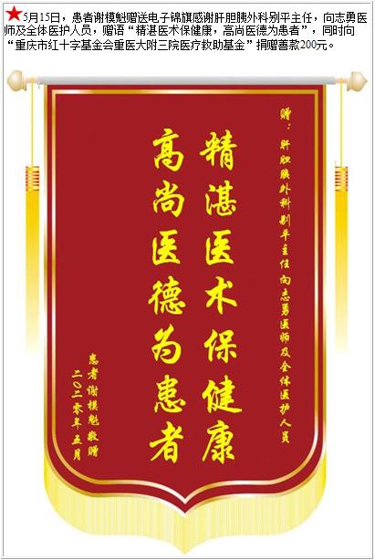 患者谢模魁赠送电子锦旗感谢肝胆胰外科别平主任等人及全体医护人员,并向医疗救助基金捐赠善款200元-锦旗-患者心声-患者服务-重庆医科大学附属第三医院【官方网站】