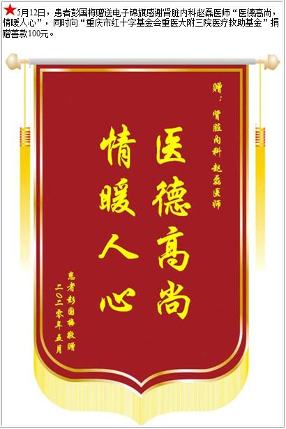 患者彭国梅赠送电子锦旗感谢肾脏内科赵磊医师,并向医疗救助基金捐赠善款100元-锦旗-患者心声-患者服务-重庆医科大学附属第三医院【官方网站】