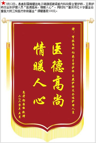 患者彭国梅赠送电子锦旗感谢肾脏内科向葵主管护师等人及全体护理人员,并向医疗救助基金捐赠善款100元-锦旗-患者心声-患者服务-重庆医科大学附属第三医院【官方网站】