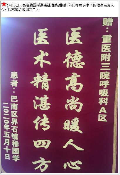 患者穆国学送来锦旗感谢胸外科邢祥菊医生“医德高尚暖人心,医术精湛传四方”-锦旗-患者心声-患者服务-重庆医科大学附属第三医院【官方网站】