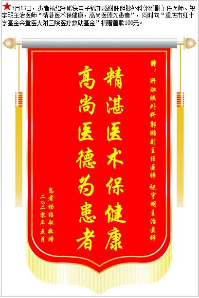 患者杨绍敏赠送电子锦旗感谢肝胆胰外科郭鹏副主任医师等人,并向医疗救助基金捐赠善款100元-锦旗-患者心声-患者服务-重庆医科大学附属第三医院【官方网站】