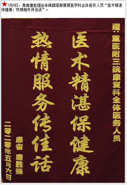 患者唐胜强送来锦旗感谢康复医学科全体医务人员“医术精湛保健康,热情服务传佳话”-锦旗-患者心声-患者服务-重庆医科大学附属第三医院【官方网站】