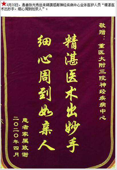 患者张光秀送来锦旗感谢神经疾病中心全体医护人员“精湛医术出妙手,细心周到如亲人”-锦旗-患者心声-患者服务-重庆医科大学附属第三医院【官方网站】