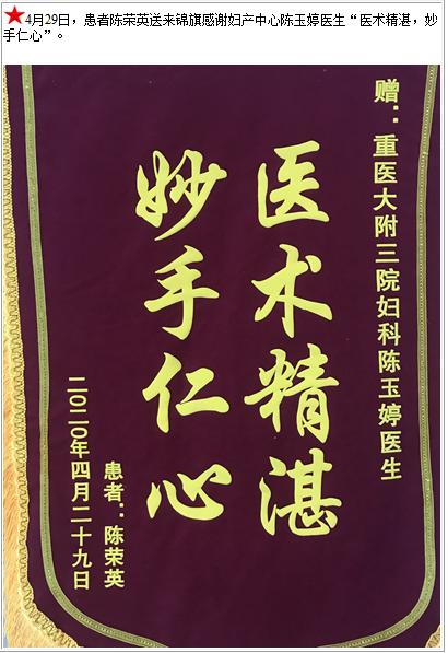 患者陈荣英送来锦旗感谢妇产中心陈玉婷医生“医术精湛,妙手仁心”-锦旗-患者心声-患者服务-重庆医科大学附属第三医院【官方网站】