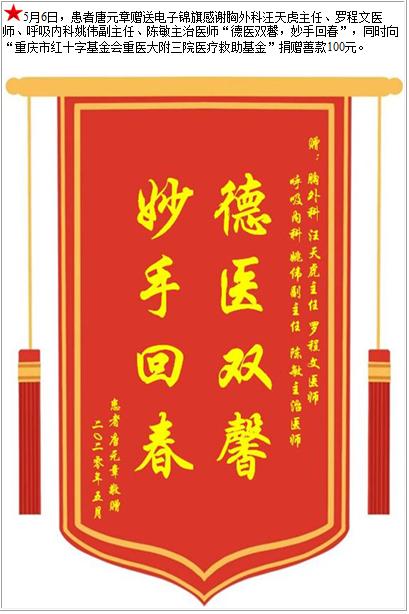 患者唐元章赠送电子锦旗感谢胸外科汪天虎主任等人,并向医疗救助基金捐赠善款100元-锦旗-患者心声-患者服务-重庆医科大学附属第三医院【官方网站】