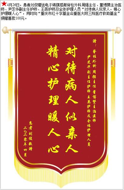 患者刘俊赠送电子锦旗感谢脊柱外科周强主任等人及全体护理人员,并向医疗救助基金捐赠善款100元-锦旗-患者心声-患者服务-重庆医科大学附属第三医院【官方网站】