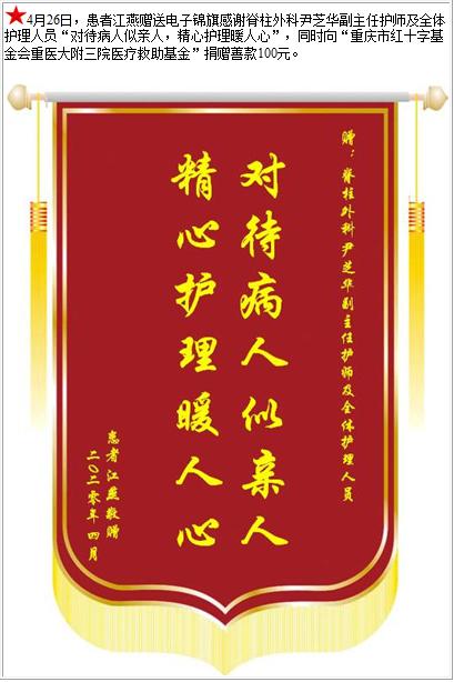 患者江燕赠送电子锦旗感谢脊柱外科尹芝华副主任护师及全体护理人员,并向医疗救助基金捐赠善款100元-锦旗-患者心声-患者服务-重庆医科大学附属第三医院【官方网站】