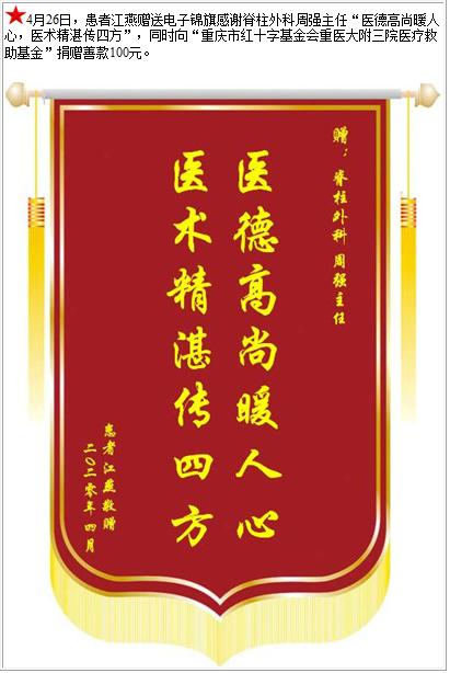 患者江燕赠送电子锦旗感谢脊柱外科周强主任,并向医疗救助基金捐赠善款100元-锦旗-患者心声-患者服务-重庆医科大学附属第三医院【官方网站】