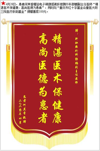 患者何其香赠送电子锦旗感谢肝胆胰外科郭鹏副主任医师,并向医疗救助基金捐赠善款100元