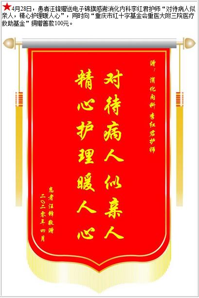 患者汪锋赠送电子锦旗感谢消化内科李红君护师,并向医疗救助基金捐赠善款100元-锦旗-患者心声-患者服务-重庆医科大学附属第三医院【官方网站】