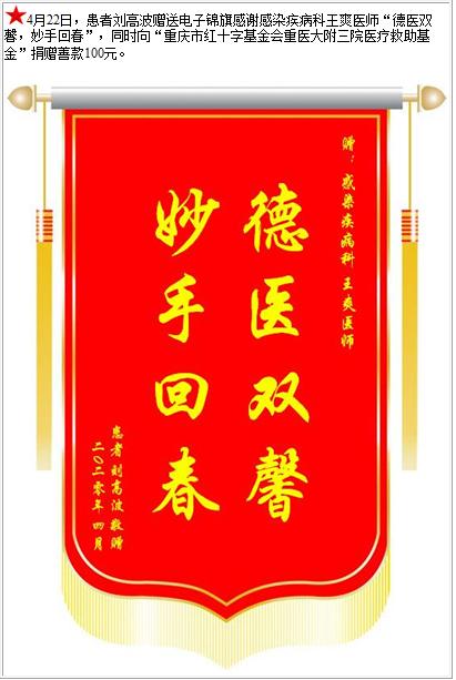 患者刘高波赠送电子锦旗感谢感染疾病科王爽医师,并向医疗救助基金捐赠善款100元-锦旗-患者心声-患者服务-重庆医科大学附属第三医院【官方网站】