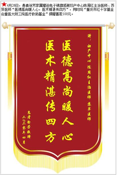 患者徐芳家属赠送电子锦旗感谢妇产中心陈周红主治医师等人,并向医疗救助基金捐赠善款100元-锦旗-患者心声-患者服务-重庆医科大学附属第三医院【官方网站】