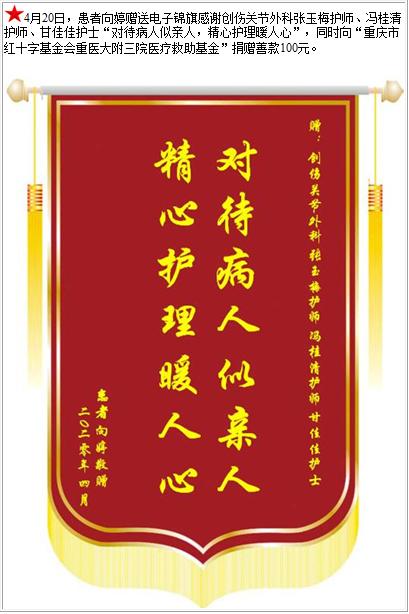 患者向婷赠送电子锦旗感谢创伤关节外科张玉梅护师等人,并向医疗救助基金捐赠善款100元-锦旗-患者心声-患者服务-重庆医科大学附属第三医院【官方网站】
