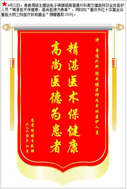 患者周培生赠送电子锦旗感谢普通外科谢文健医师及全体医护人员,并向医疗救助基金捐赠善款100元-锦旗-患者心声-患者服务-重庆医科大学附属第三医院【官方网站】