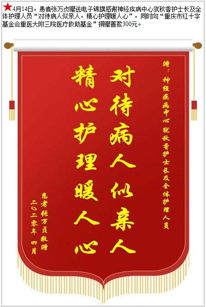 患者张万贞赠送电子锦旗感谢神经疾病中心犹秋香护士长及全体护理人员,并向医疗救助基金捐赠善款300元-锦旗-患者心声-患者服务-重庆医科大学附属第三医院【官方网站】