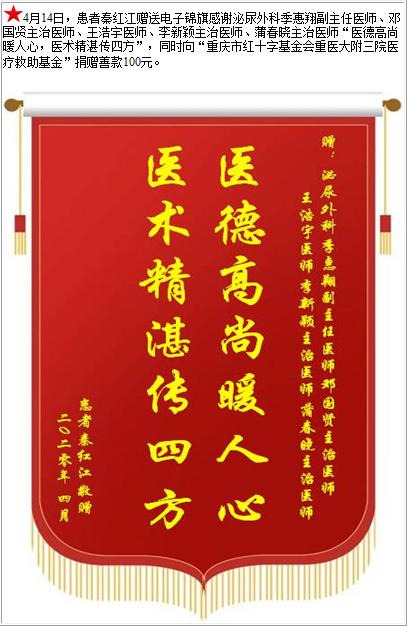 患者秦红江赠送电子锦旗感谢泌尿外科季惠翔副主任医师等人,并向院医疗救助基金捐赠善款100元-锦旗-患者心声-患者服务-重庆医科大学附属第三医院【官方网站】