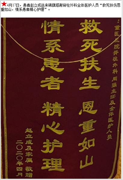 患者赵立成送来锦旗感谢脊柱外科全体医护人员“救死扶伤恩重如山,情系患者精心护理”-锦旗-患者心声-患者服务-重庆医科大学附属第三医院【官方网站】