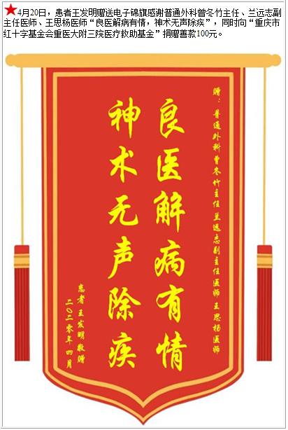 患者王发明赠送电子锦旗感谢普通外科曾冬竹主任等人,并向医疗救助基金捐赠善款100元-锦旗-患者心声-患者服务-重庆医科大学附属第三医院【官方网站】