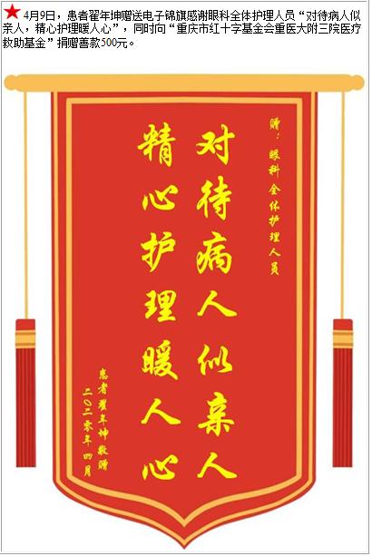 患者翟年坤赠送电子锦旗感谢眼科全体护理人员,并向医疗救助基金捐赠善款500元-锦旗-患者心声-患者服务-重庆医科大学附属第三医院【官方网站】