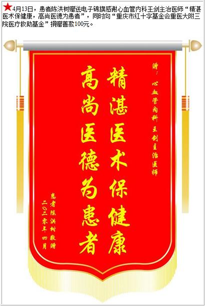 患者陈洪树赠送电子锦旗感谢心血管内科王剑主治医师,并向医疗救助基金捐赠善款100元-锦旗-患者心声-患者服务-重庆医科大学附属第三医院【官方网站】