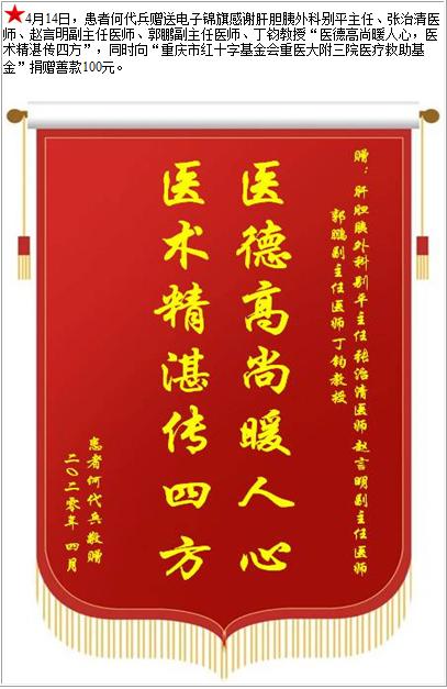 患者何代兵赠送电子锦旗感谢肝胆胰外科别平主任等人,并向医疗救助基金捐赠善款100元-锦旗-患者心声-患者服务-重庆医科大学附属第三医院【官方网站】