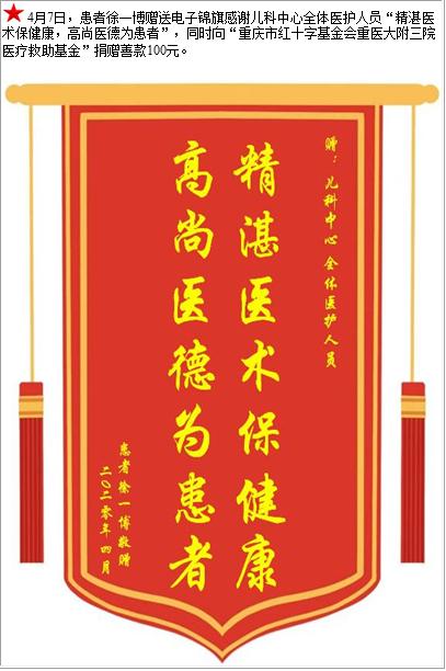 患者徐一博赠送电子锦旗感谢儿科中心全体医护人员,并向医疗救助基金捐赠善款100元-锦旗-患者心声-患者服务-重庆医科大学附属第三医院【官方网站】