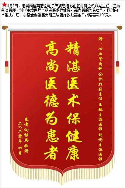患者向桂英赠送电子锦旗感谢心血管内科仝识非副主任等人,并向医疗救助基金捐赠善款100元-锦旗-患者心声-患者服务-重庆医科大学附属第三医院【官方网站】