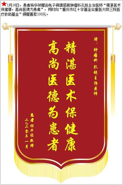 患者杨华祯赠送电子锦旗感谢肿瘤科孔锐主治医师,并向医疗救助基金捐赠善款100元-锦旗-患者心声-患者服务-重庆医科大学附属第三医院【官方网站】