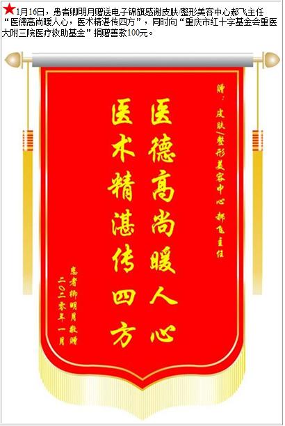 患者卿明月赠送电子锦旗感谢皮肤/整形美容中心郝飞主任,并向医疗救助基金捐赠善款100元-锦旗-患者心声-患者服务-重庆医科大学附属第三医院【官方网站】