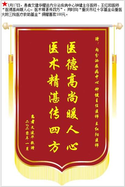 患者文建华赠送内分泌疾病中心钟健主任医师等人,并向医疗救助基金捐赠善款100元-锦旗-患者心声-患者服务-重庆医科大学附属第三医院【官方网站】