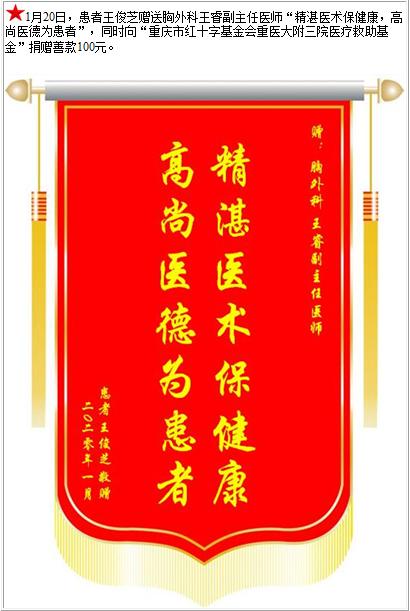 患者王俊芝赠送胸外科王睿副主任医师,并向医疗救助基金捐赠善款100元-锦旗-患者心声-患者服务-重庆医科大学附属第三医院【官方网站】