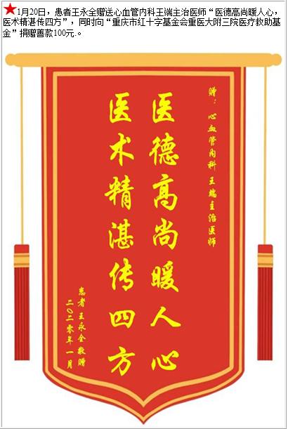 患者王永全赠送心血管内科王端主治医师,并向医疗救助基金捐赠善款100元-锦旗-患者心声-患者服务-重庆医科大学附属第三医院【官方网站】