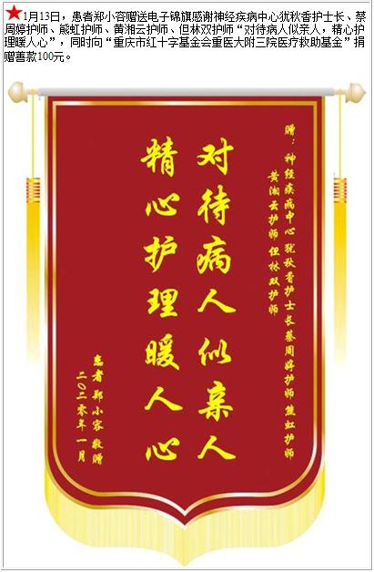 患者郑小容赠送电子锦旗感谢神经疾病中心犹秋香护士长等人,并向医疗救助基金捐赠善款100元-锦旗-患者心声-患者服务-重庆医科大学附属第三医院【官方网站】