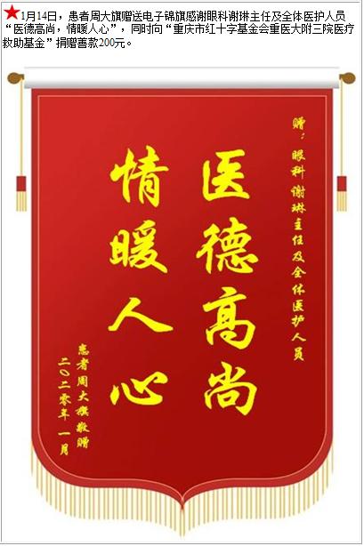 患者周大旗赠送电子锦旗感谢眼科谢琳主任及全体医护人员,并向医疗救助基金捐赠善款200元-锦旗-患者心声-患者服务-重庆医科大学附属第三医院【官方网站】