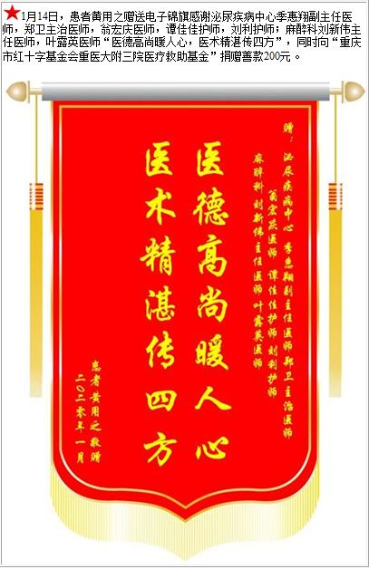 患者黄用之赠送电子锦旗感谢泌尿疾病中心及麻醉科,并向医疗救助基金捐赠善款200元-锦旗-患者心声-患者服务-重庆医科大学附属第三医院【官方网站】