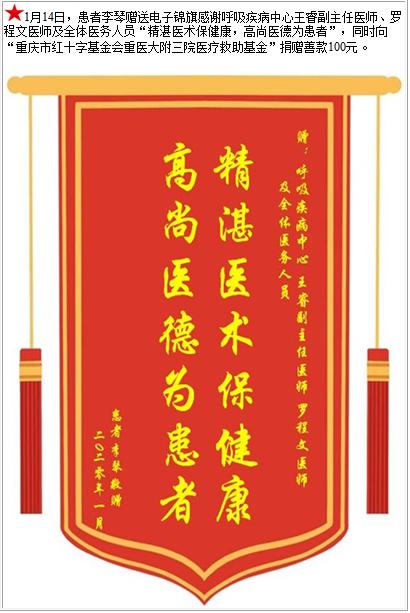 患者李琴赠送电子锦旗感谢呼吸疾病中心王睿副主任等人及全体医务人员,并向医疗救助基金捐赠善款100元-锦旗-患者心声-患者服务-重庆医科大学附属第三医院【官方网站】