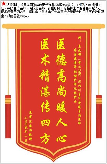 患者淳国治赠送电子锦旗感谢急救部(中心ICU)闫柏刚主任等人,并向医疗救助基金捐赠善款100元-锦旗-患者心声-患者服务-重庆医科大学附属第三医院【官方网站】