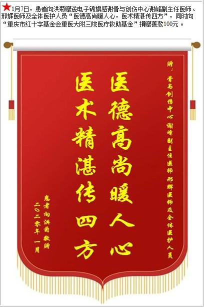 患者向洪菊赠送电子锦旗感谢骨与创伤中心谢峰副主任医师等人及全体医护人员,并向医疗救助基金捐赠善款100元-锦旗-患者心声-患者服务-重庆医科大学附属第三医院【官方网站】
