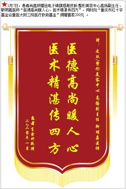 患者肖鑫妍赠送电子锦旗感谢皮肤/整形美容中心高扬副主任等人,并向医疗救助基金捐赠善款200元-锦旗-患者心声-患者服务-重庆医科大学附属第三医院【官方网站】