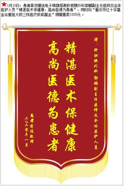 患者蒋俊赠送电子锦旗感谢肝胆胰外科郭鹏副主任医师及全体医护人员,并向医疗救助基金捐赠善款1000元-锦旗-患者心声-患者服务-重庆医科大学附属第三医院【官方网站】