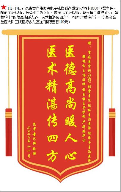 患者童作伟赠送电子锦旗感谢重症医学科(ICU) 张雷主任等人,并向医疗救助基金捐赠善款100元-锦旗-患者心声-患者服务-重庆医科大学附属第三医院【官方网站】