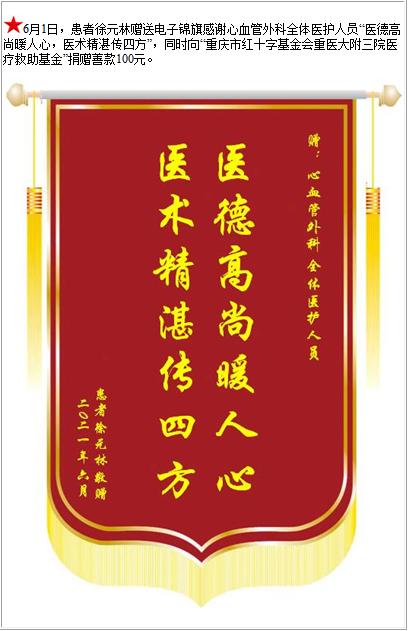 患者徐元林赠送电子锦旗感谢心血管外科全体医护人员,并向医疗救助基金捐赠善款100元-锦旗-患者心声-患者服务-重庆医科大学附属第三医院【官方网站】