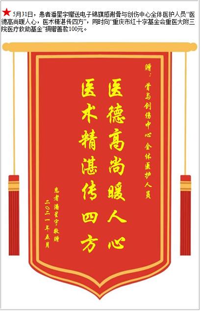 患者潘星宇赠送电子锦旗感谢骨与创伤中心全体医护人员,并向医疗救助基金捐赠善款100元-锦旗-患者心声-患者服务-重庆医科大学附属第三医院【官方网站】